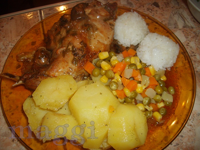 и се нареждат в тавата върху зеленчуците. Слагат се 3 дафинови листа. Купата от пастата се пълни с вода, посолява се и се излива върху месото, наръсва се с олио и се покрива с фолио.