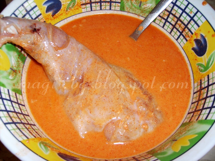 Заекът се измива, нарязва се на порции (около 10) и се овкусява със сол и соев сос. Порциите се овалват в смес, приготвена от брашното, червения пипер, чубрицата и 1 ч.ч. вода.